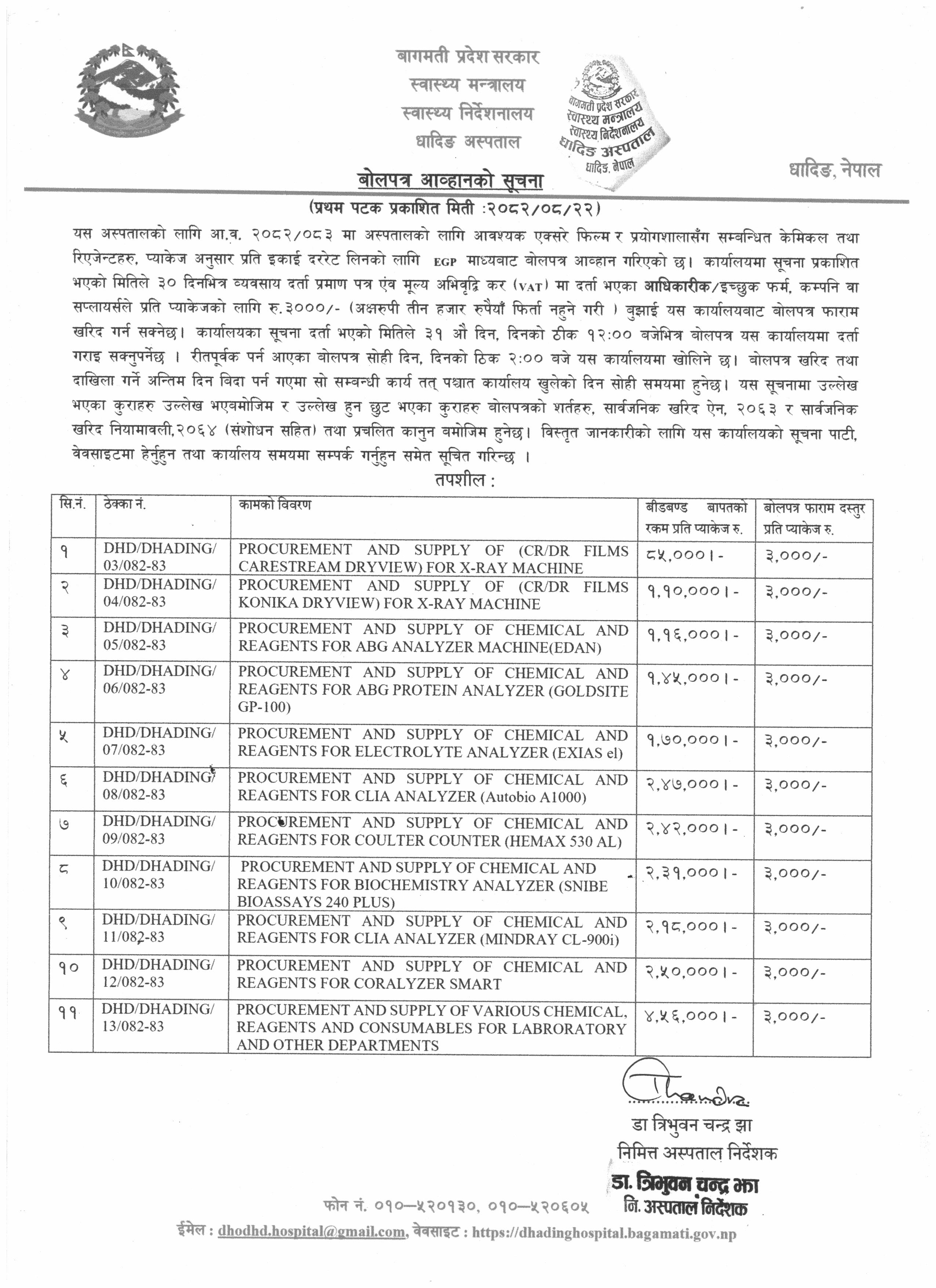 बाेलपत्र आव्हानकाे सूचना सम्बन्धमा DHD/DHADING/03/082-83 TO DHD/DHADING 13/082-83 |