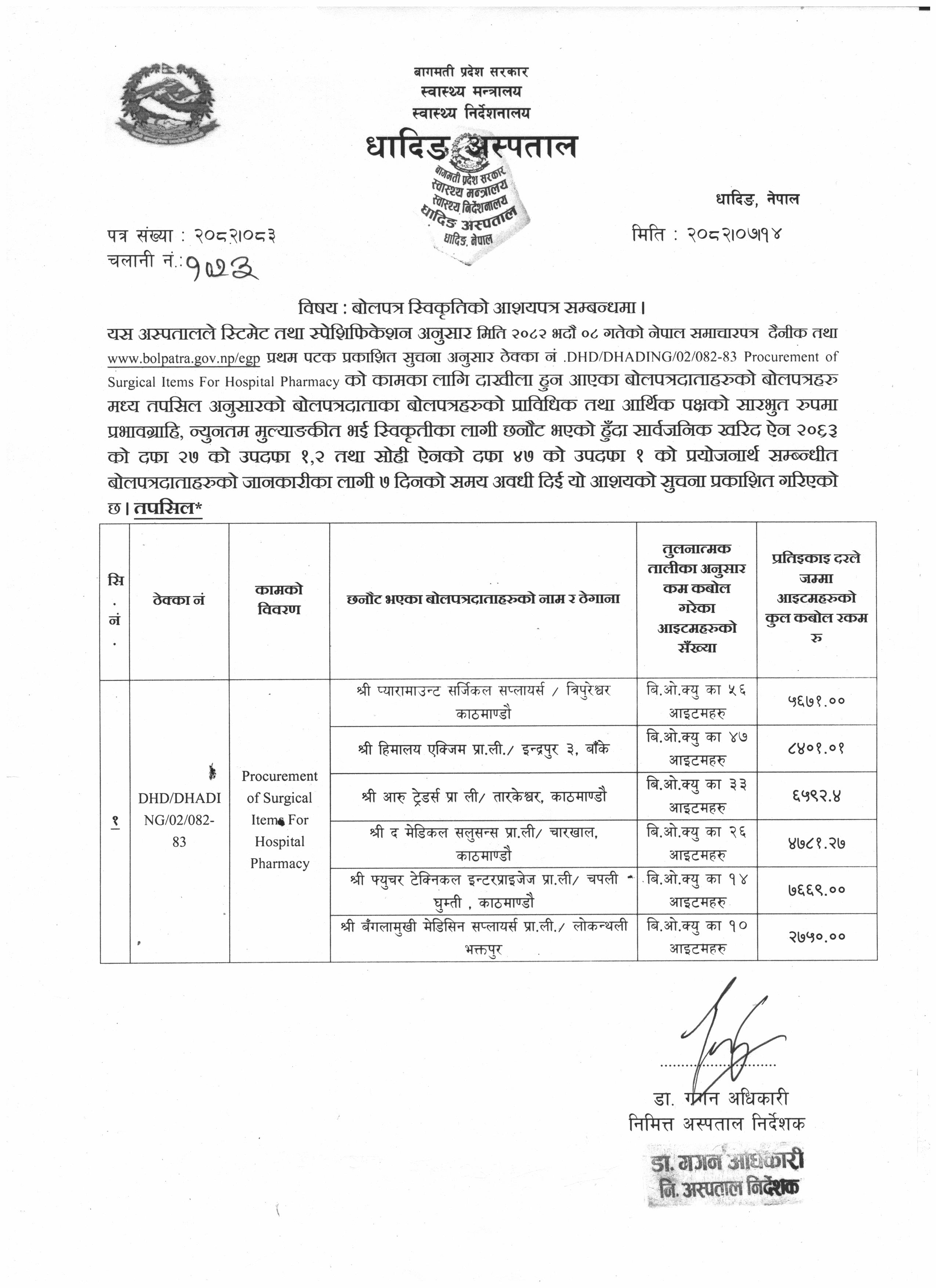 बोलपत्र स्विकृतिको आशयपत्र सम्बन्धमा सर्जिकल सामानहरु DHD/DHADING/02/082-83 |