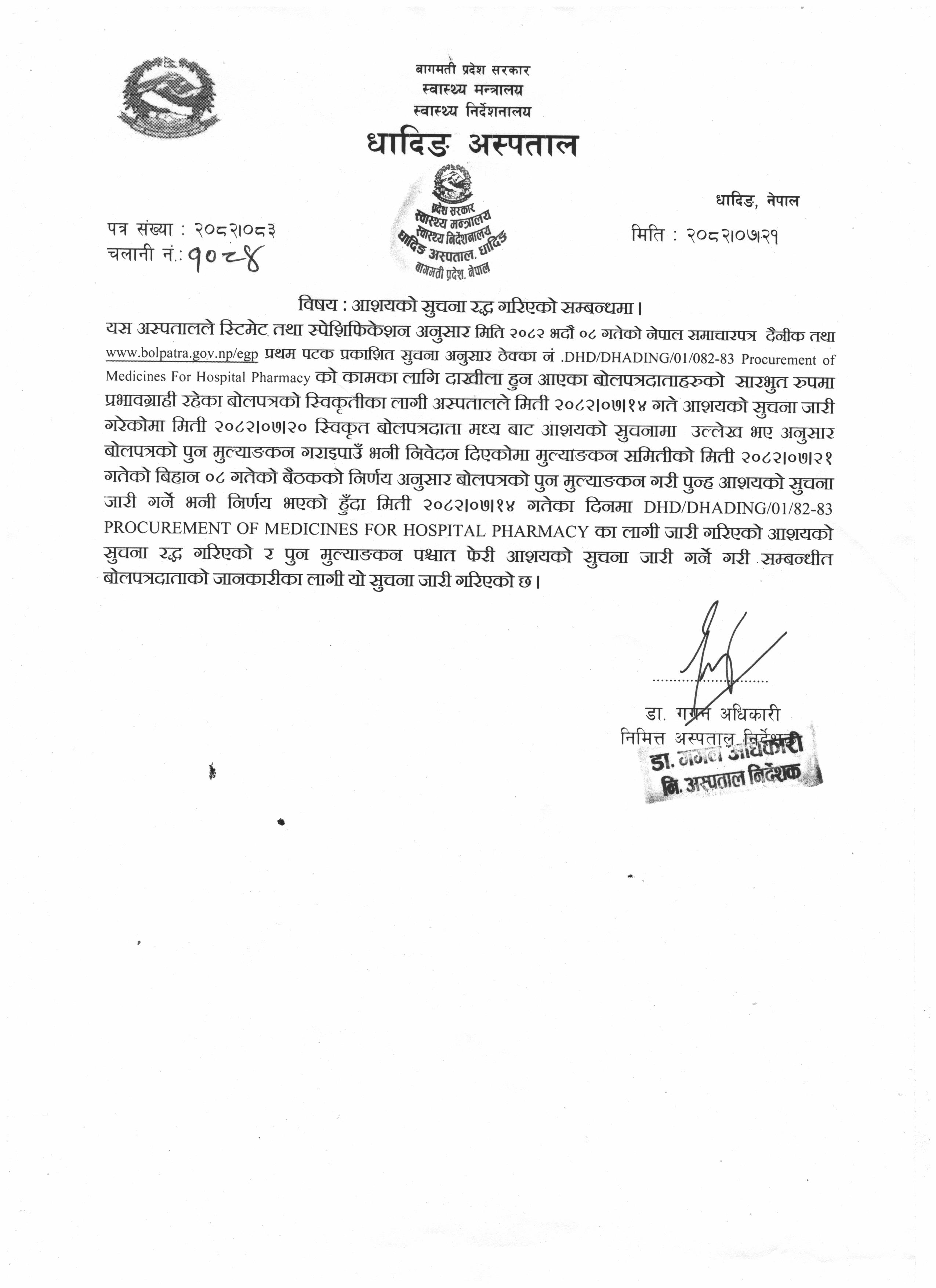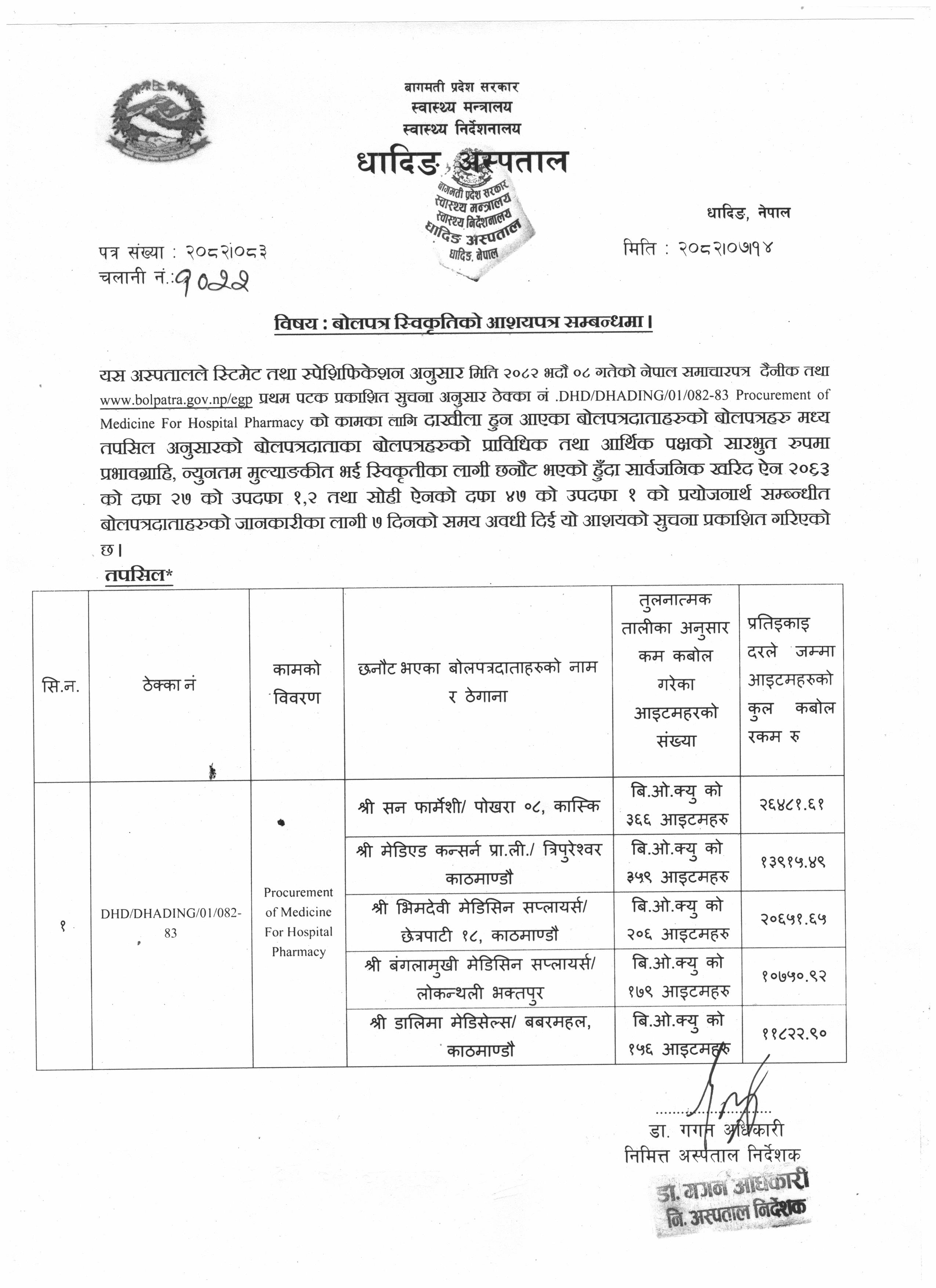 बोलपत्र स्विकृतिको आशयपत्र सम्बन्धमा औषधि DHD/DHADING/01/082-83 |